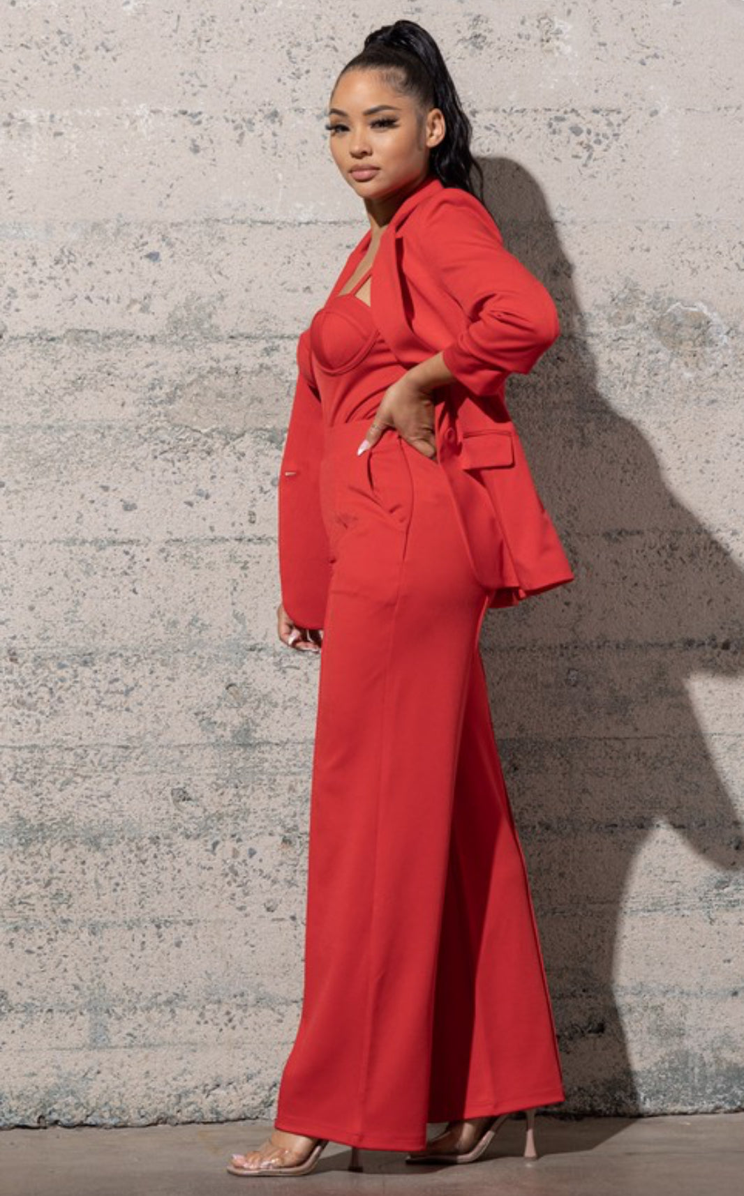 "Expertly designed for maximum comfort and style, this TMHB three-piece red suit set is a must-have for any occasion. Made from high-quality, stretchy cotton material, the bodysuit provides a perfect fit and allows for effortless movement. Elevate your wardrobe with this versatile and stylish set."