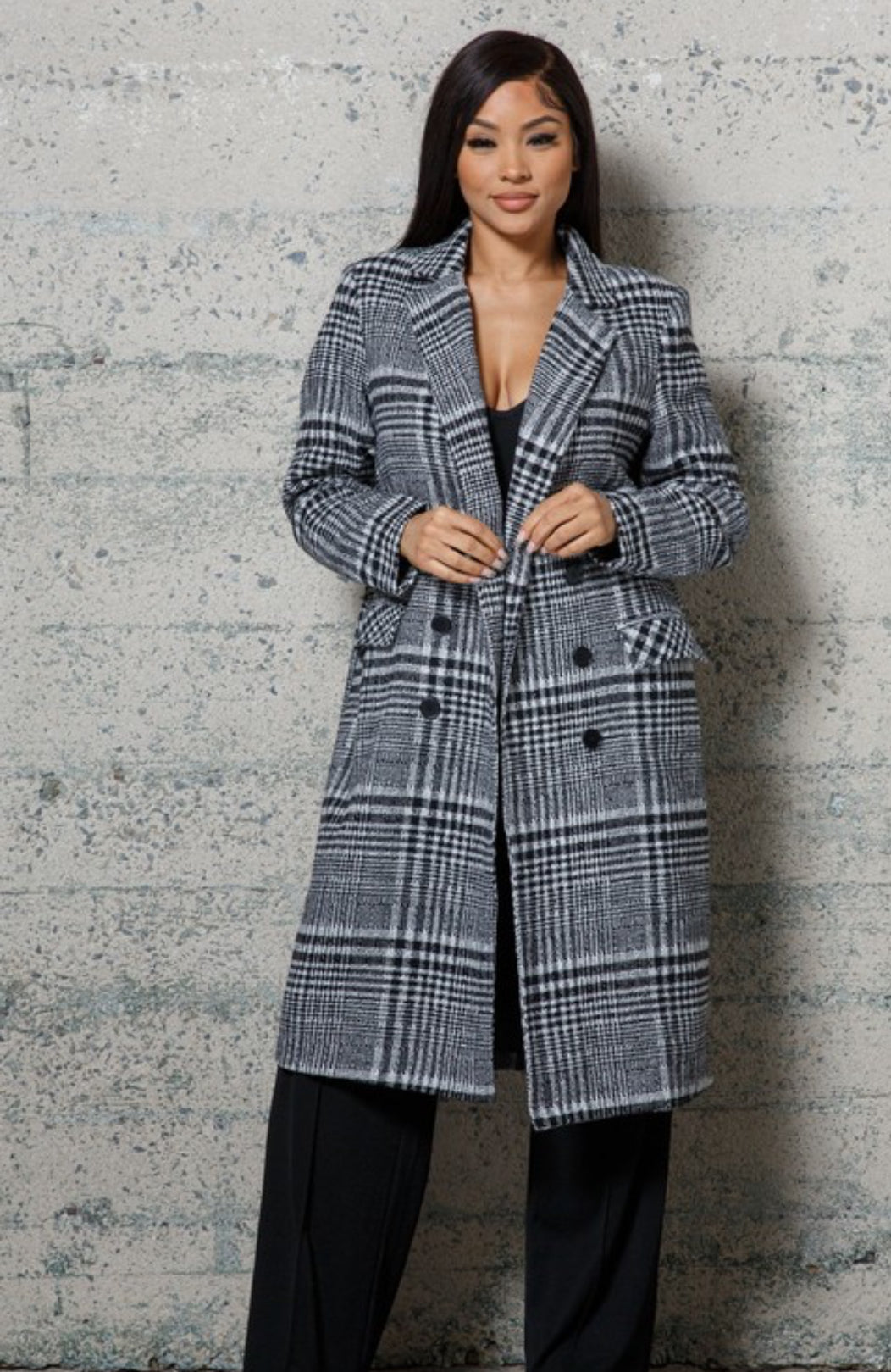 Expertly crafted with a stylish black and white checkered pattern, the TMHB Constance Coat is the perfect addition to any winter wardrobe. Made with high-quality wool, this coat not only provides warmth but also exudes sophistication and timeless style. Elevate your look with this must-have outerwear piece.