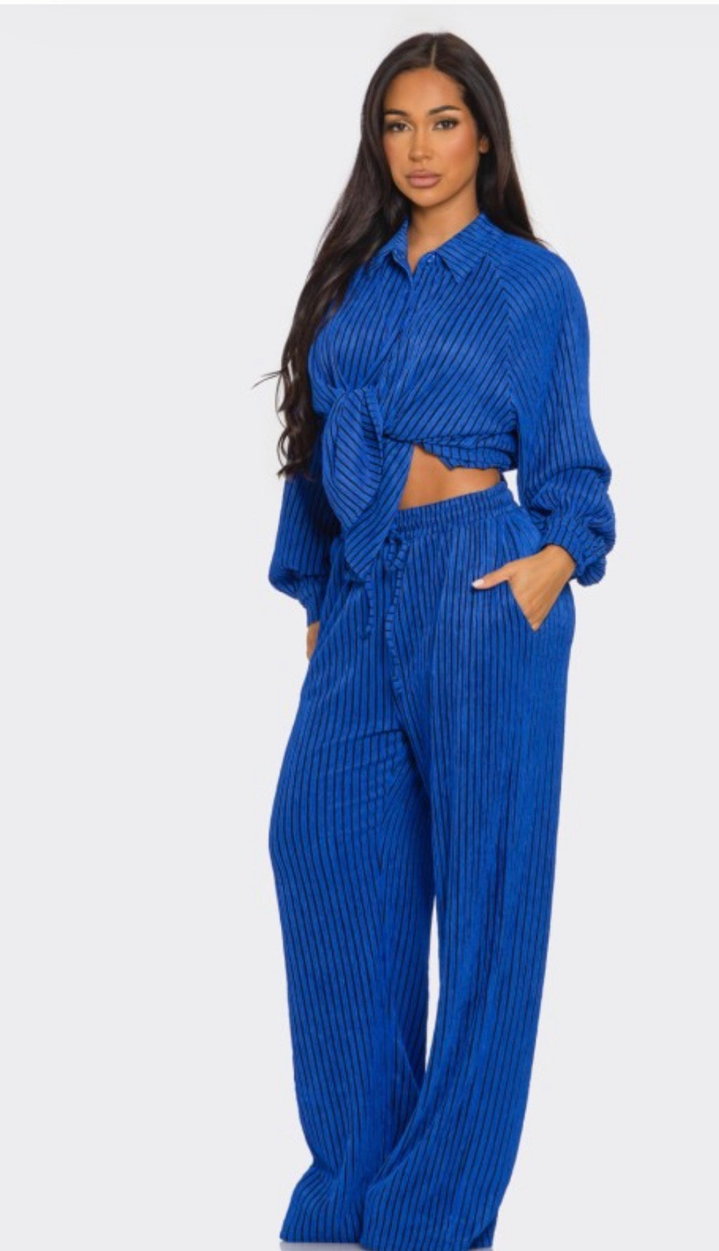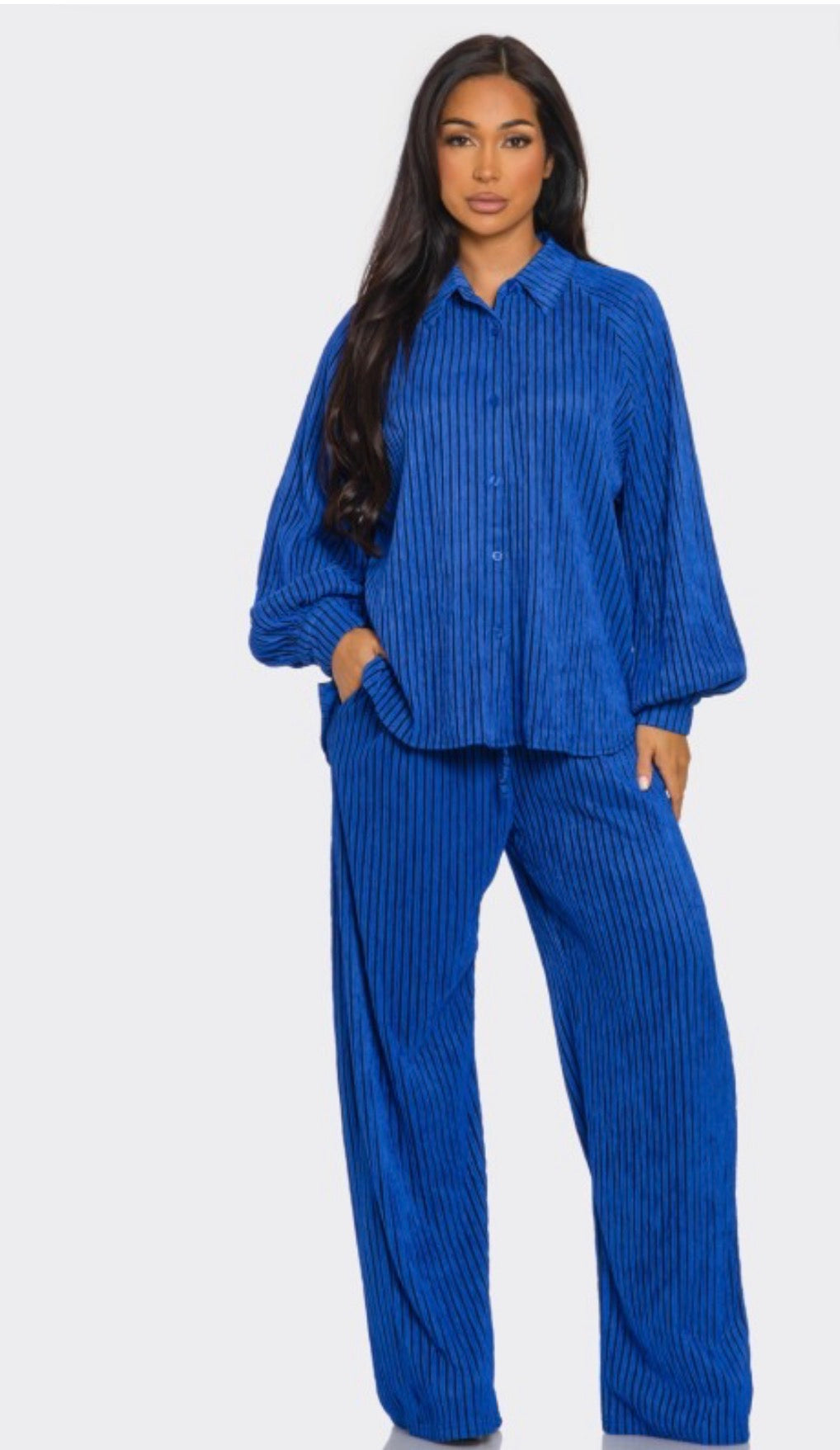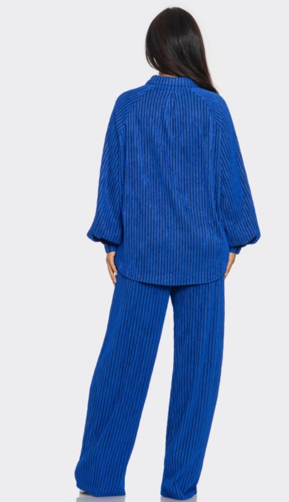 The TMHB Demure Set offers a premium, oversized fit with soft, royal blue fabric and black piping. Perfect for a jumpsuit look or a comfortable fit with plenty of room. Ladies can size down for a more structured silhouette.
